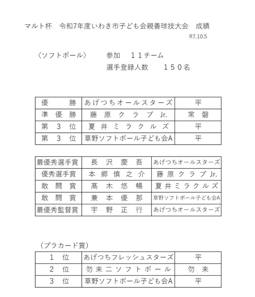 マルト杯 令和7年度 いわき市子ども会親善球技大会【開催日】 2024年10月5日(日)【会場】 小名浜市民グラウンド令和7年度のマルト杯いわき市子ども会親善球技大会が開催されました。 11チームが大会出場いたしました。 手作りのプラカードを先頭に、恒例の入場行進からスタート、個性溢れた素晴らしいプラカードでした。 プラカード賞は、選手の顔写真とグローブ、野球ボールを作った「あげつちフレッシュスターズ」でした! 素敵なプラカードありがとうございます。選手、保護者、関係者の皆様お疲れ様でした。結果は以下の通りです。