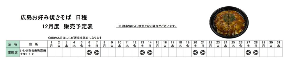 12月度 窪田店限定「広島お好み焼きそば」販売日程