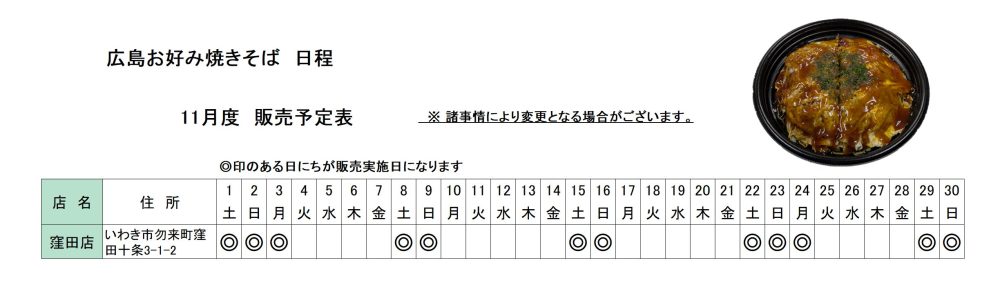 11月度 窪田店限定「広島お好み焼きそば」販売日程