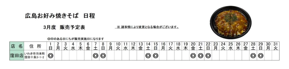 3月度 窪田店限定「広島お好み焼きそば」販売日程